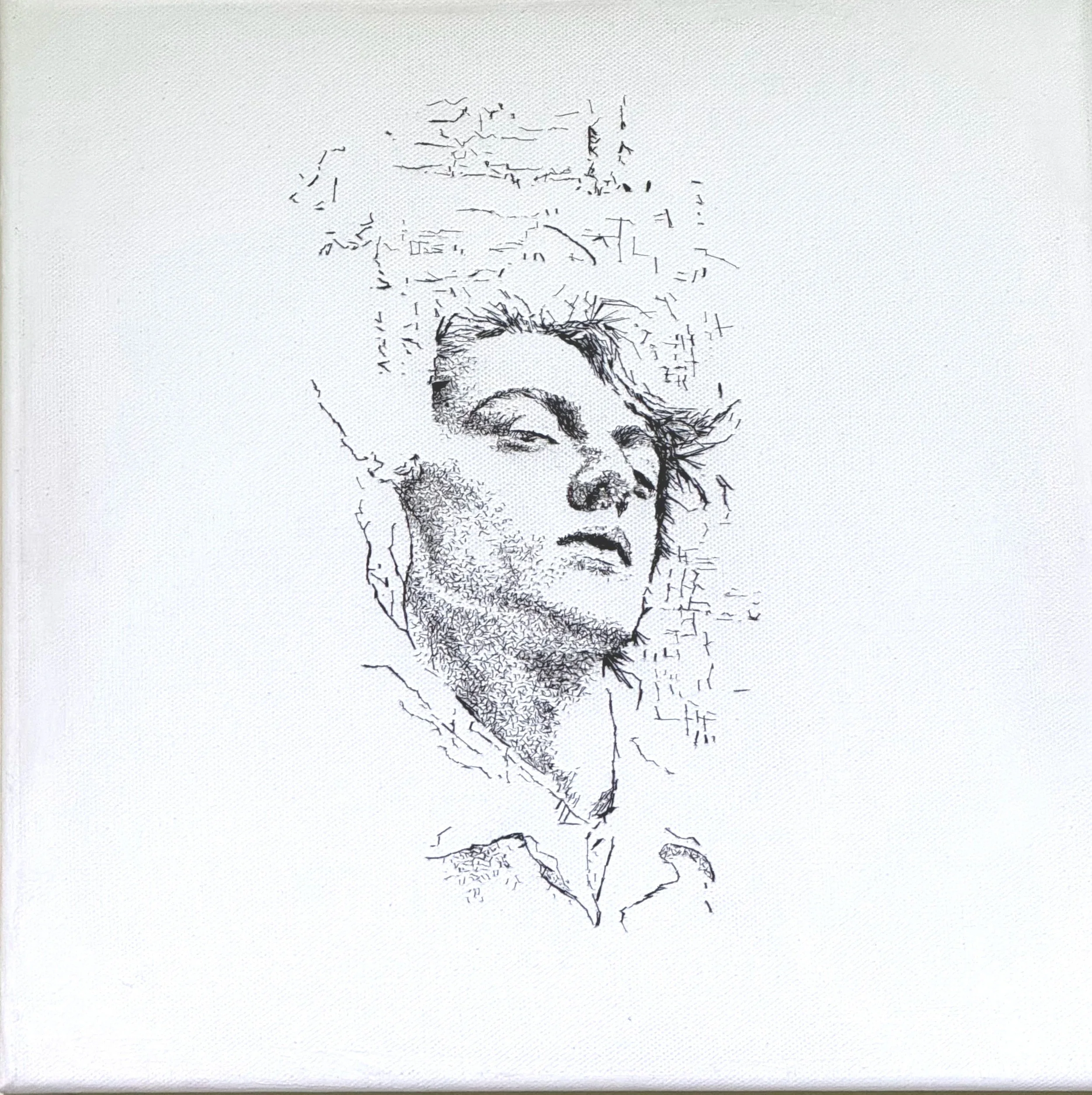 Medium: Painted on white fabric and thread sketched